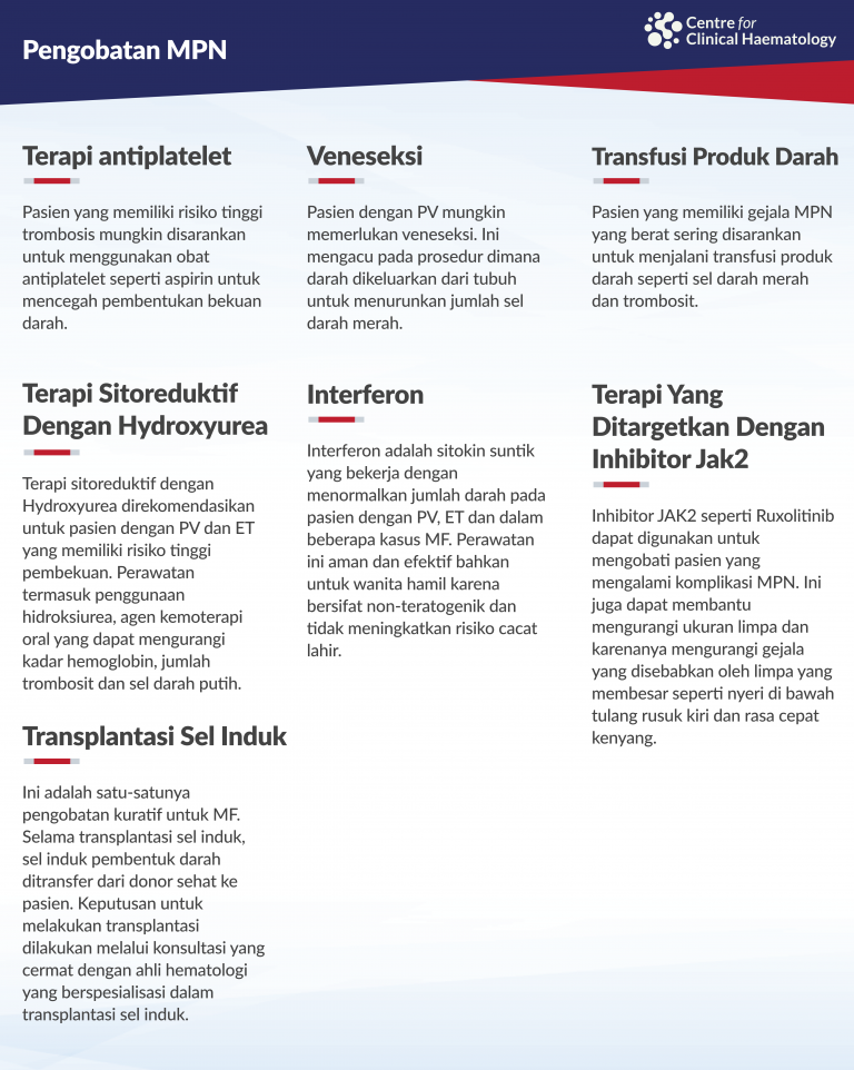 MPN diklasifikasikan menjadi 3 kondisi utama – Polisitemia Vera (PV), Essential Thrombocytosis (ET) dan Myelofibrosis (MF). Kondisi-kondisi ini ditandai dengan peningkatan dan proliferasi abnormal sel sumsum tulang seperti sel darah putih, sel darah merah dan trombosit, yang pada saatnya menyebabkan sejumlah gejala dan komplikasi. Kondisi ini berlangsung lama, bersifat progresif, dan dapat memburuk seiring waktu.