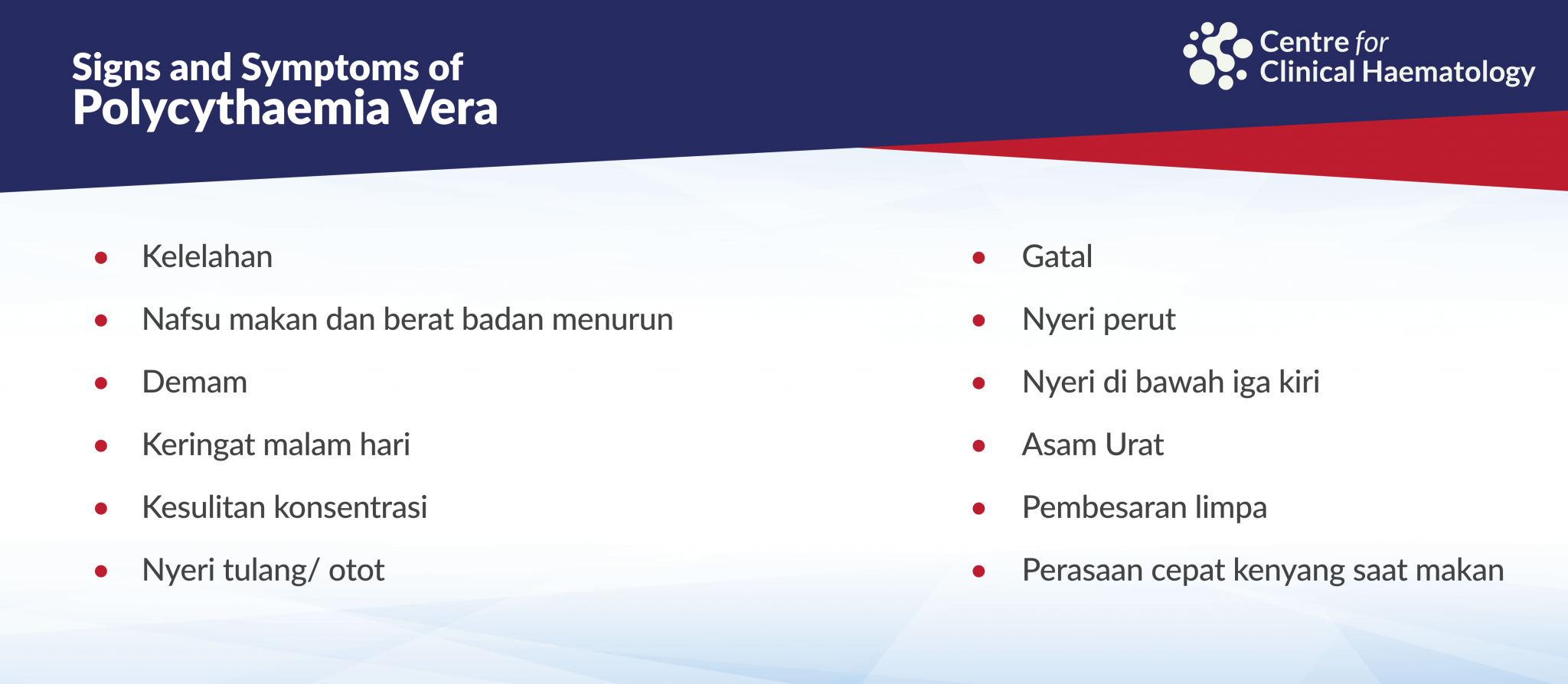 The information on the Centre For Clinical Haematology website is intended for educational use. It should not be considered or used as a substitute for medical advice, diagnosis or treatment from a qualified health professional.